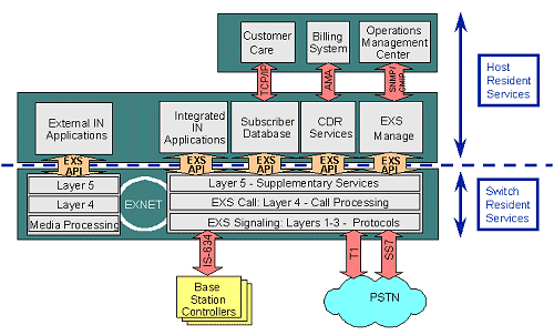 Since many different services must be implemented at this level, EXS Services provides programmable interfaces to integrate a variety of third-party services. Included are interfaces to IN services, subscriber management databases, billing, and network management systems. This permits an emerging carrier to build a complete infrastructure by integrating best-of-breed service components into ONE Architecture cost-effectively and quickly. At the same time, an incumbent operator, that has already made an investment in network infrastructure and operations support systems, has the flexibility to integrate ONE Architecture into their existing network.